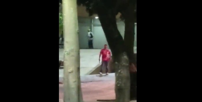 Un hombre de civil, con una camiseta roja, intimidó con un arma traumática a los manifestantes que estaban en los alrededores de la Universidad de Antioquia, como se ve en un video publicado por el Proceso Social de Garantías (PSG).