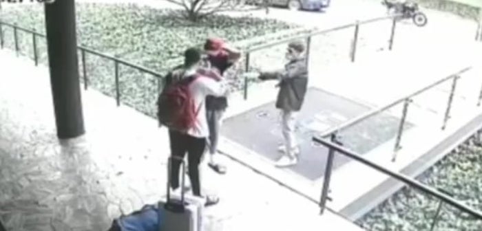 En un video que se hizo viral en redes sociales se observa cuando uno de los delincuentes intimida a los extranjeros y luego les arrebatan las cadenas y le quita el teléfono móvil, mientras que otro espera en la motocicleta en la que escaparon.