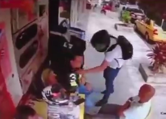 Los hechos quedaron registrados en un video de seguridad, el cual mostró al delincuente con un casco de moto y un revólver que intimida a su víctima, quien se encontraba sentada junto a otra persona.