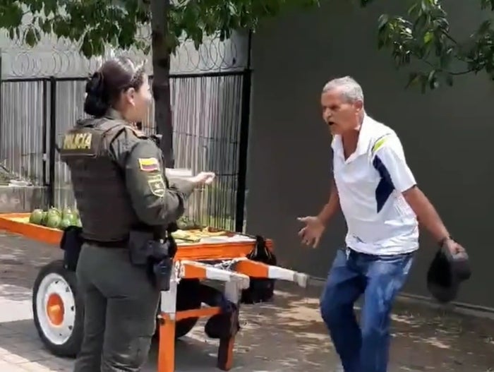 "Haga el comparendo que quiera. Cómo que no puedo trabajar. Respete a la gente. ¡Dónde está la ayuda del Gobierno, dónde está! Que uno no puede trabajar. ¿Me va a pagar el arriendo, me va a pagar la pieza?", dijo el hombre a la uniformada.