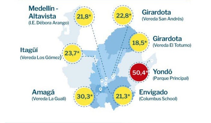 Jorge Ignacio Gaviria, el subdirector encargado de Gestión Ambiental de Corantioquia, explicó que se viene realizando el monitoreo en seis estaciones fijas, y en la mayoría de ellas hay un color amarillo, lo que significa que el aire está en un Índice de Calidad del Aire aceptable. Sin embargo, ahora en Yondó sí hay color rojo, lo que significa que es dañino para la población.