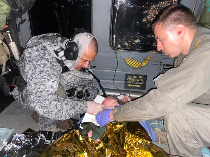 "Luego del despegue, estábamos a quince minutos de Medellín y ella continúo con su trabajo de parto, muy complicado porque no sabíamos la posición del bebé, y tuvo su bebé en vuelo. Finalmente lo entregamos a la tripulación de la ambulancia ya en tierra dentro de las mejores condiciones", detalló el teniente Juan Sánchez, rescatista de personal.