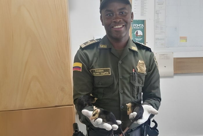 Uniformados de la Policía lograron la recuperación de tres zarigüeyas, científicamente conocidas como Delphis marsupiales, en el barrio Versalles, del municipio de Cañasgordas, Occidente antioqueño.