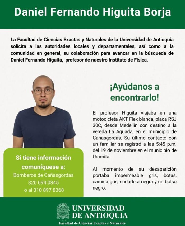 “Invocamos el apoyo de los pobladores de la zona para que compartan con los familiares del profesor Daniel Higuita y con las autoridades encargadas cualquier información que resulte de utilidad para orientar la búsqueda. Manifestamos nuestra solidaridad y acompañamiento en esta difícil situación a su familia, colegas, estudiantes y amigos”, aseguró la Universidad en un comunicado.