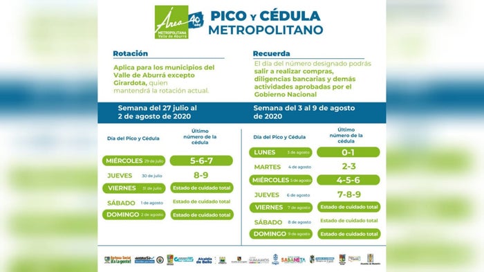 Tras el anuncio del alargamiento del periodo de aislamiento preventivo obligatorio para el mes de agosto, confirmado por el presidente de la República, Iván Duque, para combatir el pico de la pandemia del coronavirus, el Área Metropolitana, anunció cómo será la rotación del pico y cédula en el Valle de Aburrá.