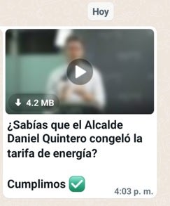 "Hola Claudia Isabel, el Poblado tiene una nueva MEGAOBRA. El puente de la avenida 34 con los Parra es una realidad. En Medellín las obras si se ven”. Así mismo la ciudadana recibió otro mensaje que dice “Sabias que el Alcalde Daniel Quintero congeló la tarifa de energía” Cumplimos, acompañado por un video de Quintero contando la decisión.