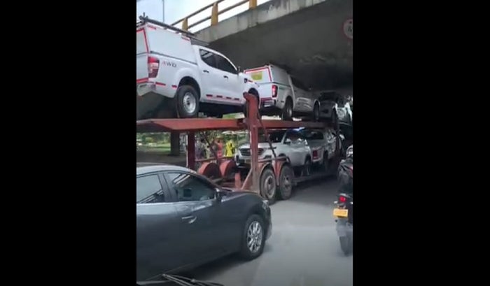 [VIDEO] ¡Por ahí no! Carro nodriza quedó atascado bajo un puente en Medellín