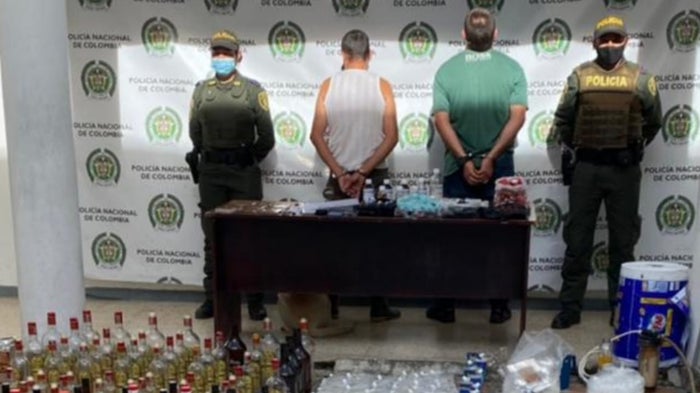 En la vereda El Recodo, en la antigua vía que de Marinilla conduce al municipio de El Santuario, en el oriente antioqueño, dos hombres de 34 y 50 años de edad, fueron capturados, momentos en que pretendían comercializar más de 150 botellas de licor adulterado de diferentes denominaciones y más de 50 cajas de aguardiente y ron.