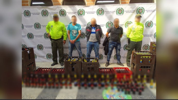 Durante el procedimiento, las autoridades capturaron a tres personas quienes, al parecer, lavaban los envases de reconocidas marcas nacionales para luego reenvasar y vender el producto en otros puntos de la capital antioqueña.