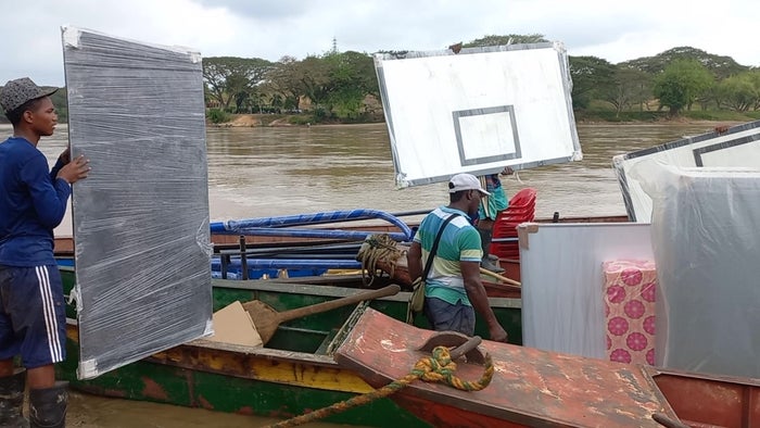 Por vía terrestre y luego en lanchas a través del río, se transportaron hasta el caserío equipamientos y mobiliarios para una cancha deportiva, la escuela, la cocina, un parque infantil y la caseta comunal.