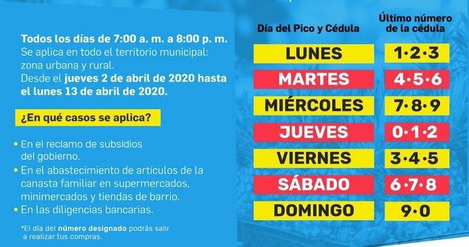 A partir de este jueves y hasta el 13 de abril, los habitantes de Medellín podrán hacer compras de primera necesidad solo dos días a la semana por la implementación del 'pico y cédula'. Según el último dígito de su documento de identidad, las personas tendrán permiso para reclamar subsidios del Gobierno, abastecerse de alimentos en supermercados y tiendas de barrio, y hacer las diligencias bancarias.
