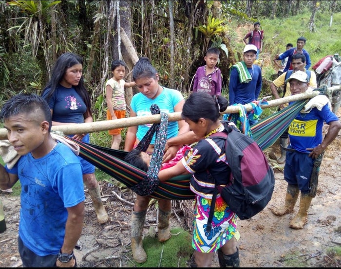 La maestra indígena Carlina Bailarín Jumi mientras era trasladada hacia la Blanquita en Frontino, (Antioquia), desde donde iba a ser evacuada en helicóptero luego de haber sido mordida por una serpiente.