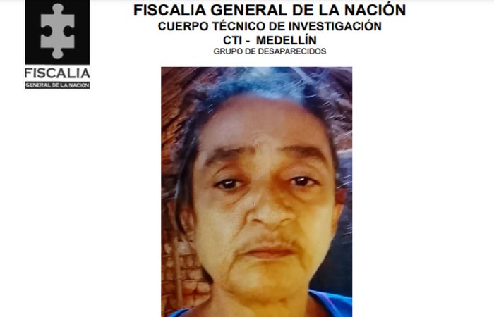 La mujer, de 70 años de edad, es de contextura delgada, piel trigueña y tiene el cabello liso y entrecano. Al momento de su desaparición vestía con buso color celeste, sudadera de flores y sandalias negras.
