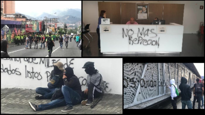 En el suroriente de la capital antioqueña, algunos trabajadores de entidades bancarias les lanzaron pintura azul. Se espera el reporte de las autoridades, quienes al final de la tarde darán un reporte y un balance de los daños materiales.