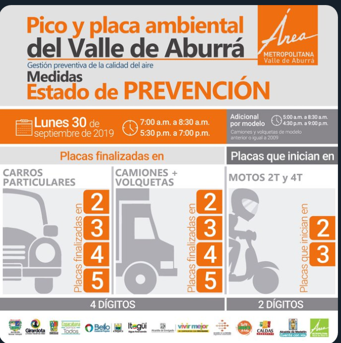 Con el pico y placa extendido a las motos de cuatro tiempos, y la restricción de circulación en determinados horarios durante los sábados de octubre, comienza el estado de prevención por la calidad del aire en Medellín y los nueve municipios del Área Metropolitana. La combinación de la época de lluvias, con las condiciones topográficas ha vuelto costumbre por lo menos dos periodos críticos al año por presencia de contaminantes.