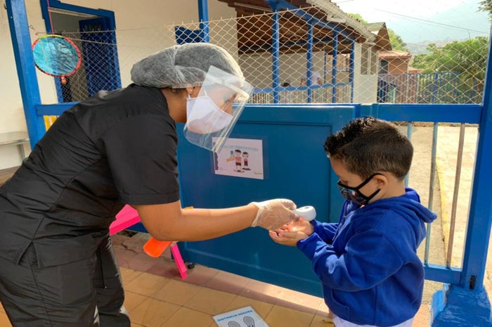 Cortesía: @Buen_Comienzo · Los niños son desinfectados antes de ingresar a las sedes de Buen Comienzo.
