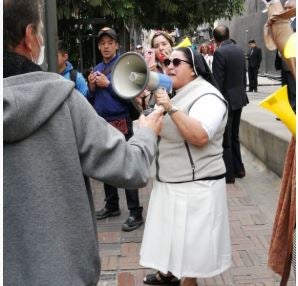 La hermana, quien se presenta como una misionera carmelita, agarró un megáfono y empezó a lanzar arengas en compañía de varios seguidores del líder del Centro Democrático. La monja, quien rompió el panorama en la mañana de este lunes con su atuendo, le pidió respeto a los detractores.
