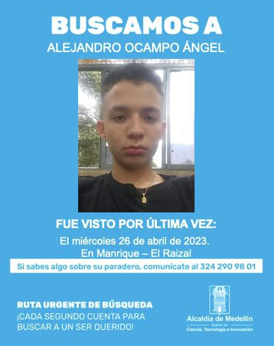 Elizabeth Ángel, la madre de Alejandro Ocampo Ángel, busca a su hijo de 18 años, quien luego de una discusión, salió de su casa ubicada en Manrique El Raizal, con rumbo desconocido.