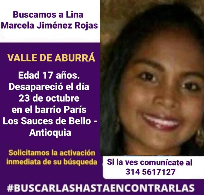 Lina Marcela Jimenez Rojas, de 17 años de edad, fue reportada como desaparecida el pasado viernes 25 de octubre en el barrio París Los Sauces de Bello, Norte del Valle de Aburrá.