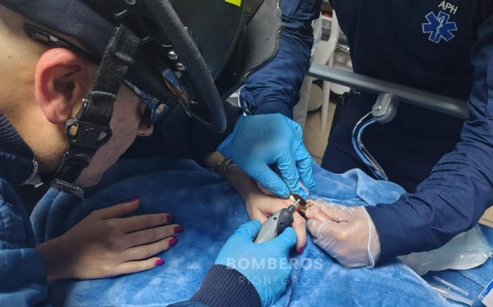Ante la falta de equipos adecuados en la clínica para realizar la extracción del anillo, el personal médico solicitó la ayuda de los bomberos. Con destreza y precisión, los bomberos utilizaron un "motortul" para cortar el anillo, liberando el dedo de la paciente sin causar daño a su extremidad.