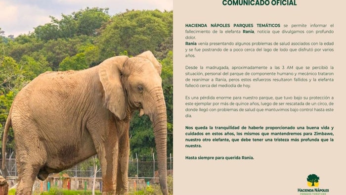 Este lunes 24 de marzo, la Hacienda Nápoles Parque Temáticos informó que la elefanta Rania falleció luego de presentar algunos problemas de salud asociados a la edad. Este ejemplar tenía un promedio de 60 - 70 años de edad y llegó al parque luego de ser exhibida en circos.