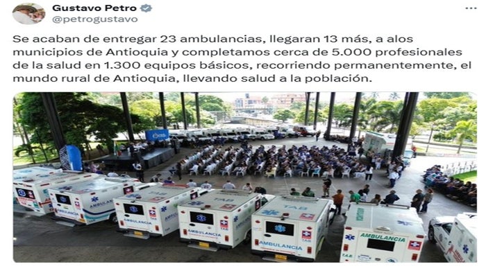 Este sábado 24 de mayo, el presidente Gustavo Petro publicó en su cuenta de X la imagen de un evento donde se encontraban entregando 23 ambulancias. El jefe de estado puso en la publicación que habían sido entregadas 23 ambulancias y 13 más llegarían a los municipios de Antioquia.