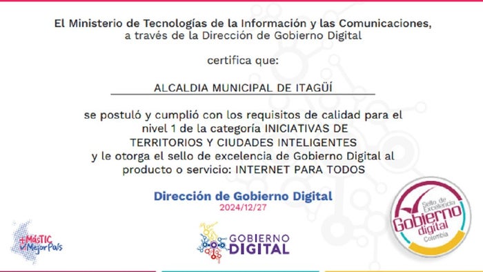 Con esta distinción, la Alcaldía de Itagüí ya suma tres sellos de certificación por parte del Ministerio de las TIC: iniciativas de territorios y ciudades inteligentes con su programa “Internet para todos”; gobierno abierto - ejercicios de participación ciudadana, por la construcción de su plan de desarrollo; y servicios en línea - trámites y servicios en línea, por más de 80 trámites a través de su sede electrónica.