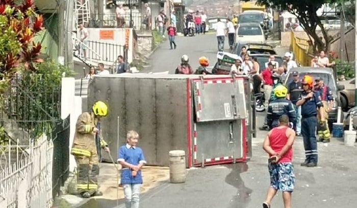 El aparatoso accidente ocurrió en la calle 94 con carrera 73A del barrio Castilla, noroccidente de Medellín, donde a un furgón, que transportaba lácteos, al parecer le falló el freno de emergencia colisionando contra un poste y la entrada de una vivienda. El vehículo quedó volcado sobre la vía.