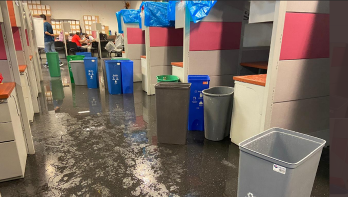 Con baldes y recogedores, funcionarios de la Personería de Medellín de nuevo tuvieron que sacar el agua que ingresó a la sede, tras el fuerte aguacero de las últimas horas. Por estar ubicada en el sótano de la Plaza de la Libertad, los chorros de agua se filtran por el techo y las paredes, dañando computadores y expedientes de los casos.