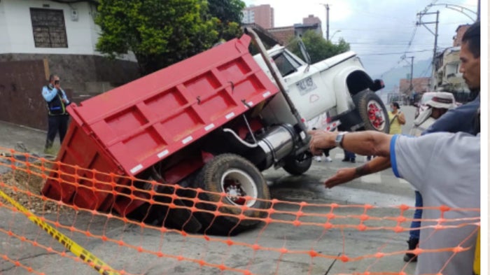Un tremendo susto se llevó el conductor de un volqueta en Bello, norte del Valle de Aburrá, cuando de un momento a otro el automotor, se fue a un hueco cuando se movilizaba por plena vía.