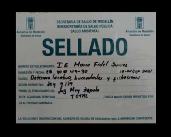 Funcionarios de la Secretaría de Salud de Medellín visitaron la sede principal de la Institución Educativa Marco Fidel Suárez, en el barrio Estadio, y detectaron “deterioro locativo, humedades y filtraciones'', así que ordenaron su clausura.