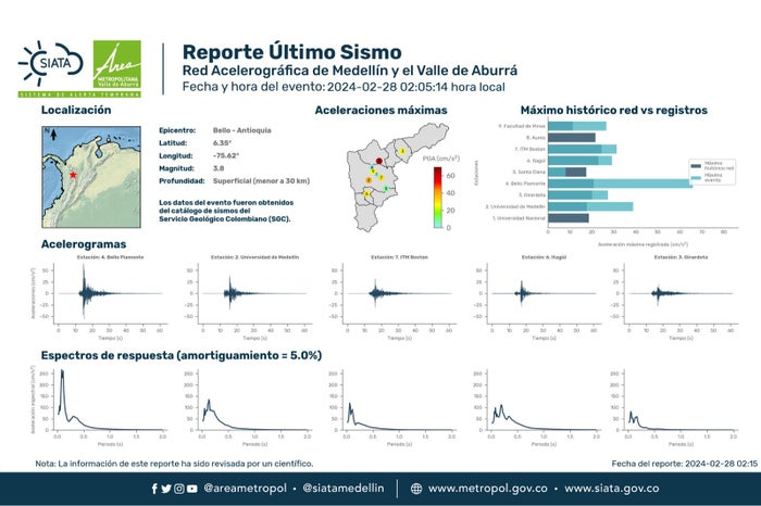 El Sistema de Alerta Temprana de Medellín y el Valle de Aburrá también reportó el fuerte movimiento telúrico e indicaron que nueve de las estaciones registraron el sismo de 4.0 grados.