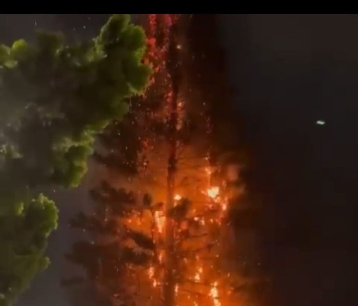 Un gigantesco pino que durante años fue referente del sector del barrio Manrique Oriental resultó consumido por las llamas provocadas, al parecer, por un volador.