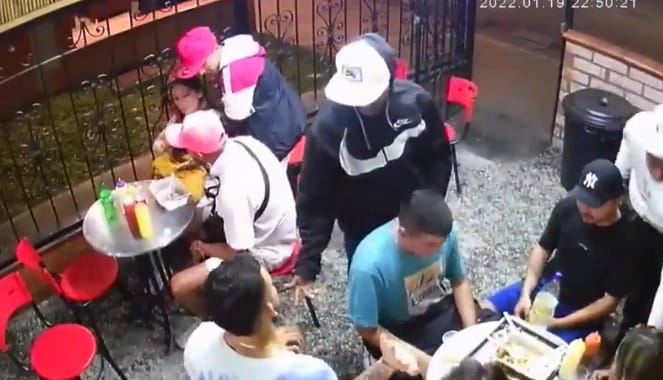 En las imágenes también se observa el momento en que uno de los comensales se rehúsa a quitarse varios elementos por lo que fue intimidado por uno de los ladrones.