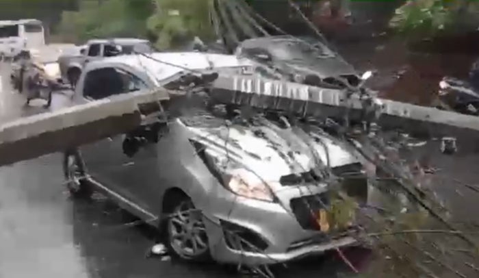 Un video que se ha hecho viral muestra el momento en que el vehículo se encontraba estacionado y le cayó un bloque de cemento, dañando parte de las latas del automotor.