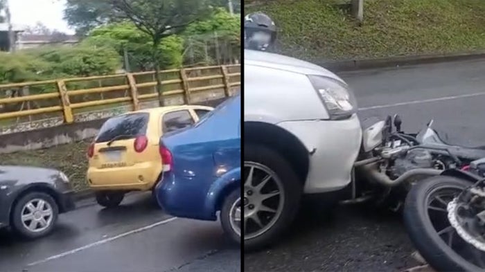 Un aparatoso choque múltiple que se presentó entre cuatro carros particulares, un taxi y una motocicleta, dejó dos personas lesionadas en un hecho que se presentó sobre la carrera 80 en inmediaciones del Colegio Mayor de Antioquia en el noroccidente de la capital antioqueña.