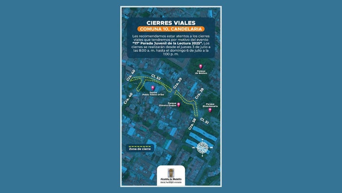La Parada Juvenil de la Lectura en su 17.° edición se tomará el centro de Medellín el sábado 5 y domingo 6 de julio. Por esta razón, la Alcaldía programó cierres viales totales en la carrera 38 entre calles 51 y 52 (La Playa), la calle 52 (La Playa) entre carreras 38 y 39 (Giraldo) y el circuito interno del Teatro Pablo Tobón Uribe.