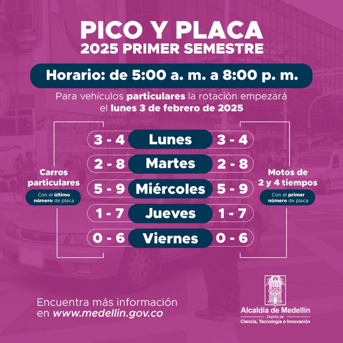 La Secretaría de Movilidad de Medellín confirmó la nueva rotación del pico y placa que empezará a regir desde el 3 de febrero en los 10 municipios del Valle de Aburrá. La medida no tendrá vías exentas en Bello e Itagüí.