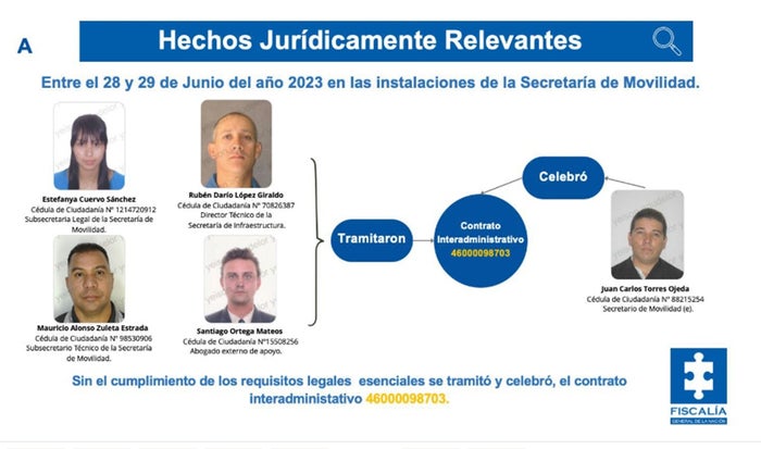 Igualmente, ante el Juzgado 10 Penal Municipal con Función de Control de Garantías de Medellín, la Fiscalía imputó a Estefanya Cuervo Sánchez, exsubsecretaria Legal de la Secretaría de Movilidad del Distrito, como coautora del delito de celebración de contrato sin cumplimiento de requisitos legales.