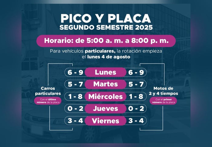 La medida será pedagógica del 4 al 8 de agosto de 2025. La multa por no acatar el Pico y Placa es de 15 salarios mínimos diarios legales vigentes y la inmovilización del vehículo.