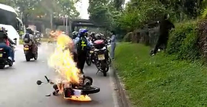La motocicleta, al parecer debido a una fuga de combustible, se incendió.