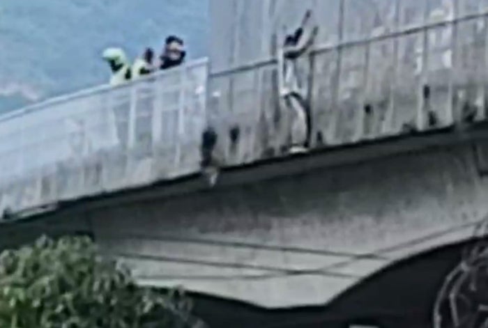 En video quedó registrado el dramático momento en que un hombre, subido a una malla de un puente, se arrojó minutos después a los rieles del Metro de Medellín. A pesar de los esfuerzos de transeúntes y organismos de socorro esta persona quedó tendida en el suelo.