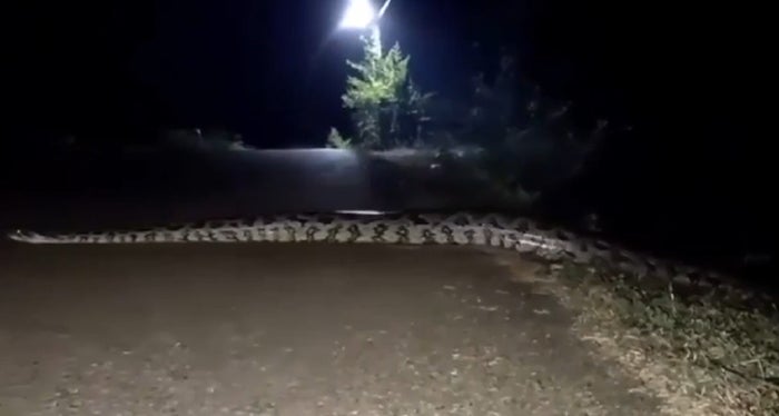 Usuarios en redes sociales compartieron el video de una enorme serpiente que se pasea por una carretera.