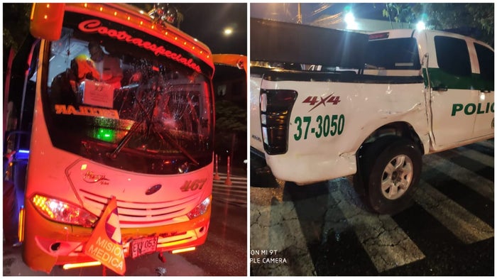 Un aparatoso accidente de tránsito protagonizaron una camioneta de la Policia y un bus de servicio público especial en el municipio de Envigado. Producto de este choque tres uniformados de la Fuerza Pública resultaron lesionados con heridas considerables.