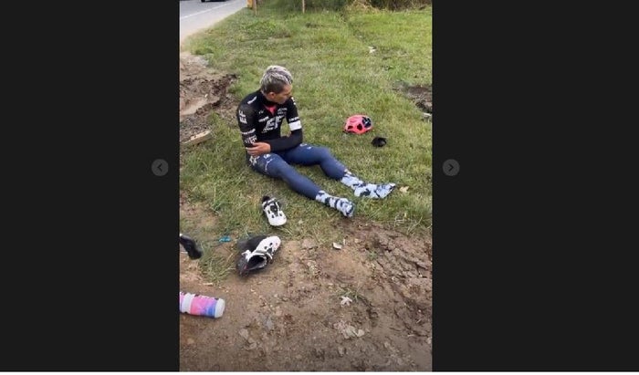 Según videos compartidos por Arroyave, cuando transitaba por la vía al Hipódromo de Llanogrande, un vehículo hizo que perdiera el control de la bicicleta y se fuera al piso a un lado de la carretera en el kilómetro 7.