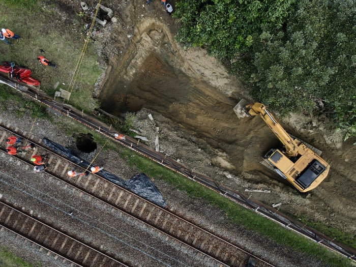 Avanzan los trabajos para atender la contingencia que se presentó entre las estaciones Caribe y Tricentenario en la línea férrea de la línea A del Metro. En el lugar hay personal especializado y los equipos se encuentran acondicionando el terreno, cubriendo los cables de alta tensión, fibra y señalización.